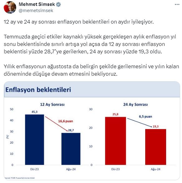 Hazine ve Maliye Bakanı Mehmet Şimşek, sosyal medya hesabı üzerinden enflasyon beklentilerine dair değerlendirmelerde bulundu.