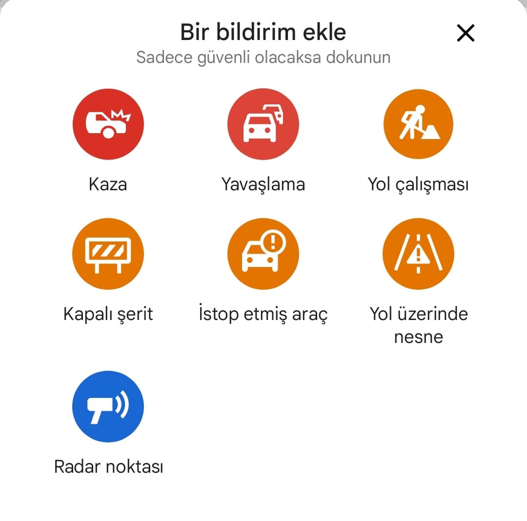 Web Tekno’da yer alan habere göre, Google Haritalar’ın yeni özelliği ile bulunduğunuz yerde kaza, yavaşlama, yol çalışması, kapalı şerit, istop etmiş araç, yol üzerinde bir nesne ya da radar noktası olup olmadığını haritaya ekleyebiliyorsunuz. Bu sayede aynı yerden geçecek sürücüler, uygulamaya eklenen bildirimi görüp ona göre rotasını değiştirebilecek, yavaşlayabilecek ya da aracı daha dikkatli kullanabilecekler.